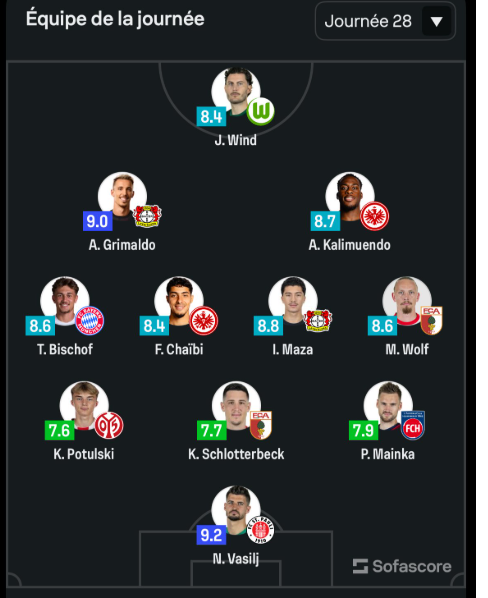 ونشر موقع “شوفاسكور”، تشكيلته المثالية الخاصة بالجولة الثامنة والعشرين من الدوري الألماني، والتي ضمت اسمي مازة، وشايبي.