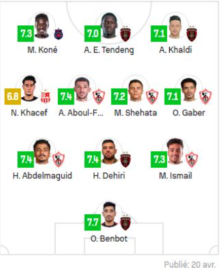 كما ضمت التشكيلة الثلاثي الآخر، الناشط في الاتحاد، حسين دهيري، بـ 7.4 وهو ثاني أعلى تقييم، بالإضافة إلى أحمد خالدي. مسجل هدف التأهل في مرمى أسفي، بـ 7.1، والسنغالي إيتيان تيندينغ، بـ 7/10.